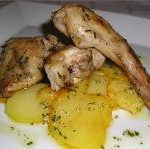 Preparamos una vinagreta de limón, que usaremos como salsa para el conejo y las patatas. Utilizaremos 8 cucharadas de aceite oliva, el zumo de medio limón, y los 2 dientes de ajo que habíamos reservado del paso anterior. Machacamos bien los 2 dientes de ajo con un mortero, hasta dejarlos como un puré. A continuación, añadimos el aceite poco a poco sin dejar de remover, con la ayuda de unas varillas manuales. Finalmente, añadimos el limón, una cucharadita de perejil picado y lo batimos hasta dejarlo bien ligado.